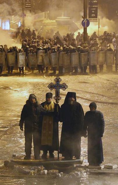 The images show the two hostile groups arrayed in ranks ready to engage. The protesters are armed with rocks and bricks and Molotov cocktails. The police are in riot gear with heavy armor and heavy weapons. Between the groups is a no man’s land littered with the debris of earlier clashes. In that danger zone, the place where conflict will occur if it does occur, stands a group of Orthodox monks. One lifts high the cross of Christ. One holds an icon. One censes the holy ground on which they stand. The monks had been invited to join the “people’s side,” but they had refused to take sides at all. They just stood there in the midst of the battlefield with the cross. They prayed. They chanted: