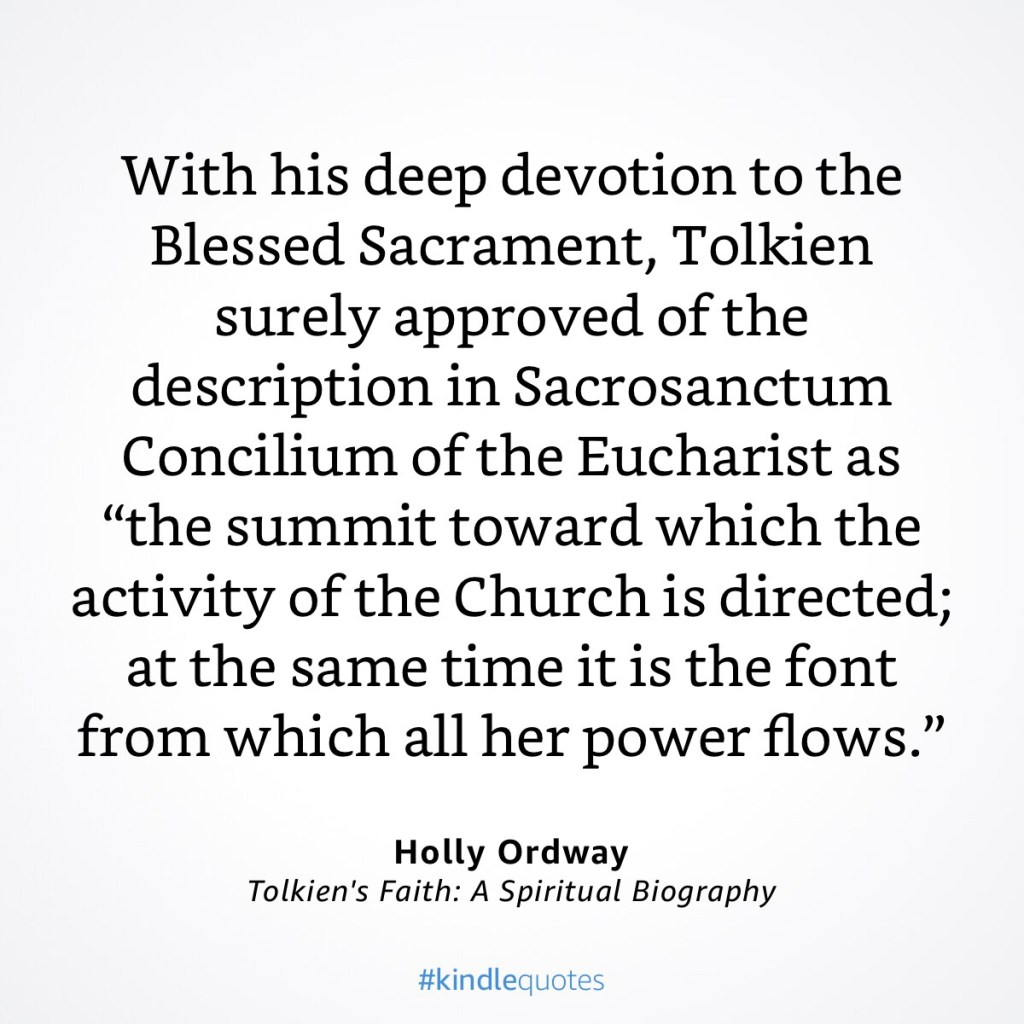 Tolkien, himself a devout Roman Catholic, did indeed have a “deep devotion” to the Blessed Sacrament. Anglicans may initially be chary of such devotion, feeling it inches a bit too close to Eucharistic adoration (rf Article XXVIII, BCP 2019, p. 783). It need not do and they need not be. Very few would hesitate to say that they are devoted to Scripture or to prayer. Why then hesitate to express devotion to the Blessed Sacrament? How could anyone who truly believes that it is the Body of Christ that is given, taken, and eaten in the Supper (ibid) express anything less than or other than devotion for the Blessed Sacrament, the summit of our worship and the font of our life?