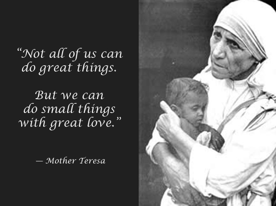 And, as we open our hearts, we must also open our hands to do good as opportunities present themselves — and they always present themselves. I cannot remedy homelessness or hunger, nor can the church, nor can the government. But I can, from time to time, relieve, at least for a moment, the hunger of this one person in front of me, the want of that person who asks me for mercy, the plight of this suffering group who appeals to me for aid. That was the example of Mother Teresa who said that not all of us can do great things, but we can all do small things with great love. I can do the small thing. You can do the small thing.
