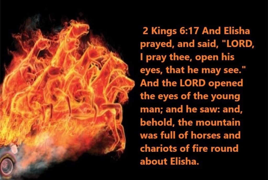 17 Then Elisha prayed and said, “O Lord, please open his eyes that he may see.” So the Lord opened the eyes of the young man, and he saw, and behold, the mountain was full of horses and chariots of fire all around Elisha (2 Ki 6:17).